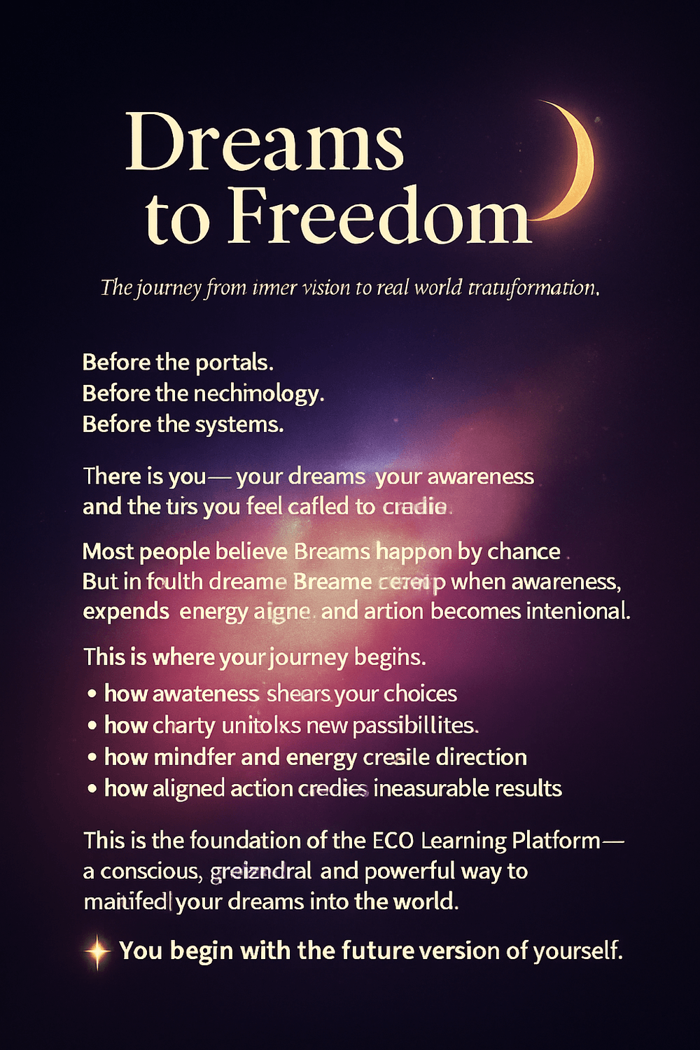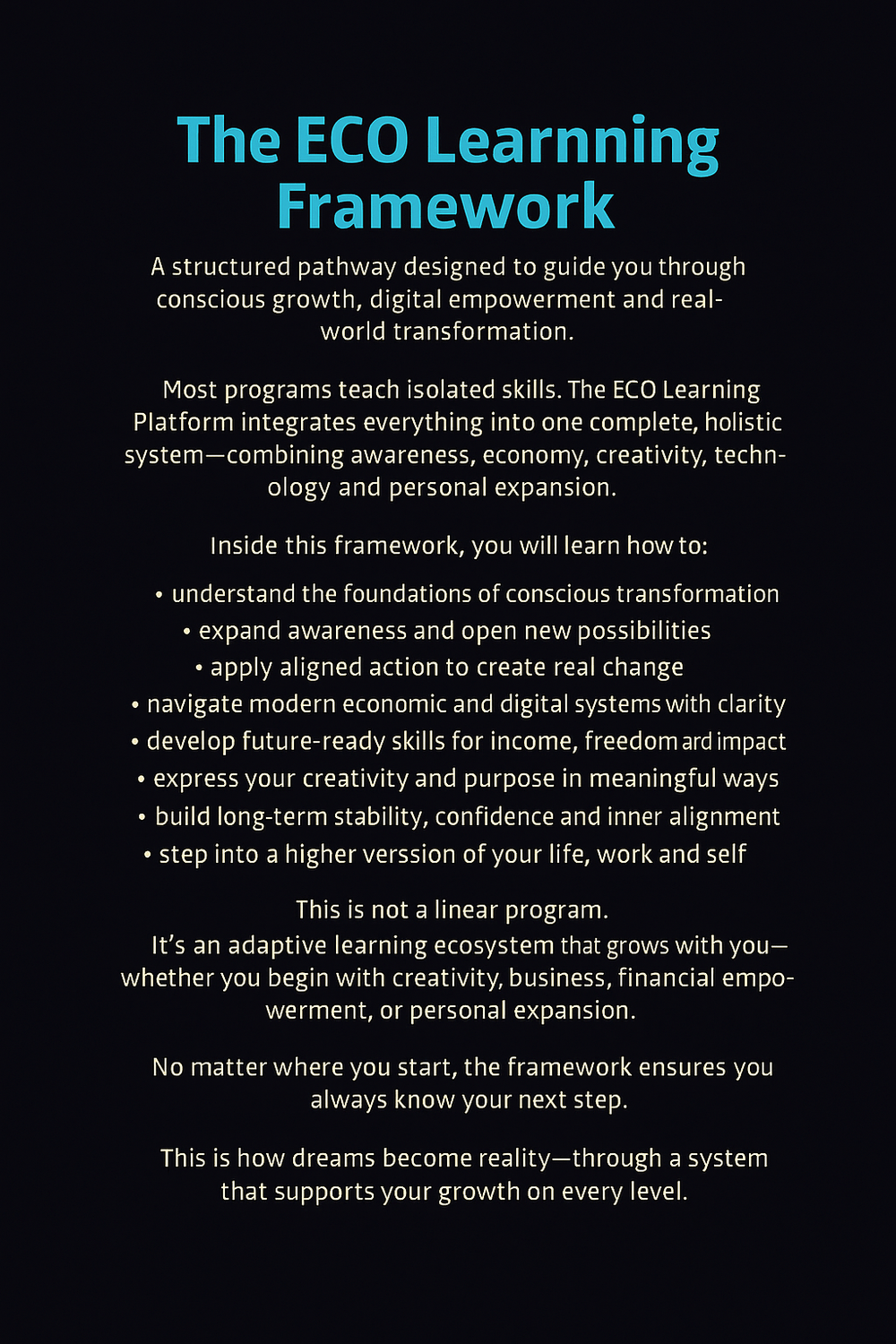 The ECO Learning Platform integrates everything into one complete, holistic system β combining awareness, economy, creativity, technology and personal expansion.