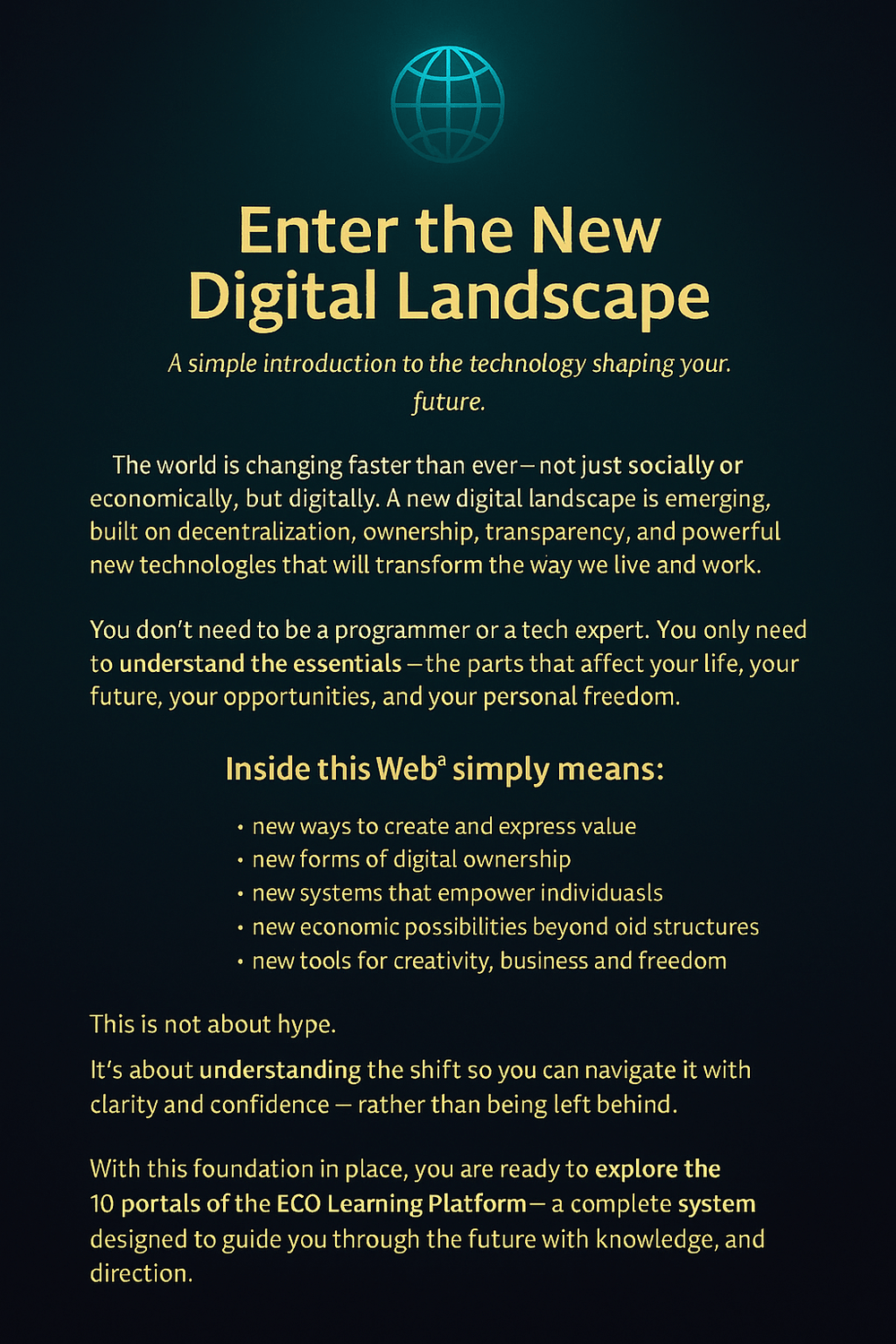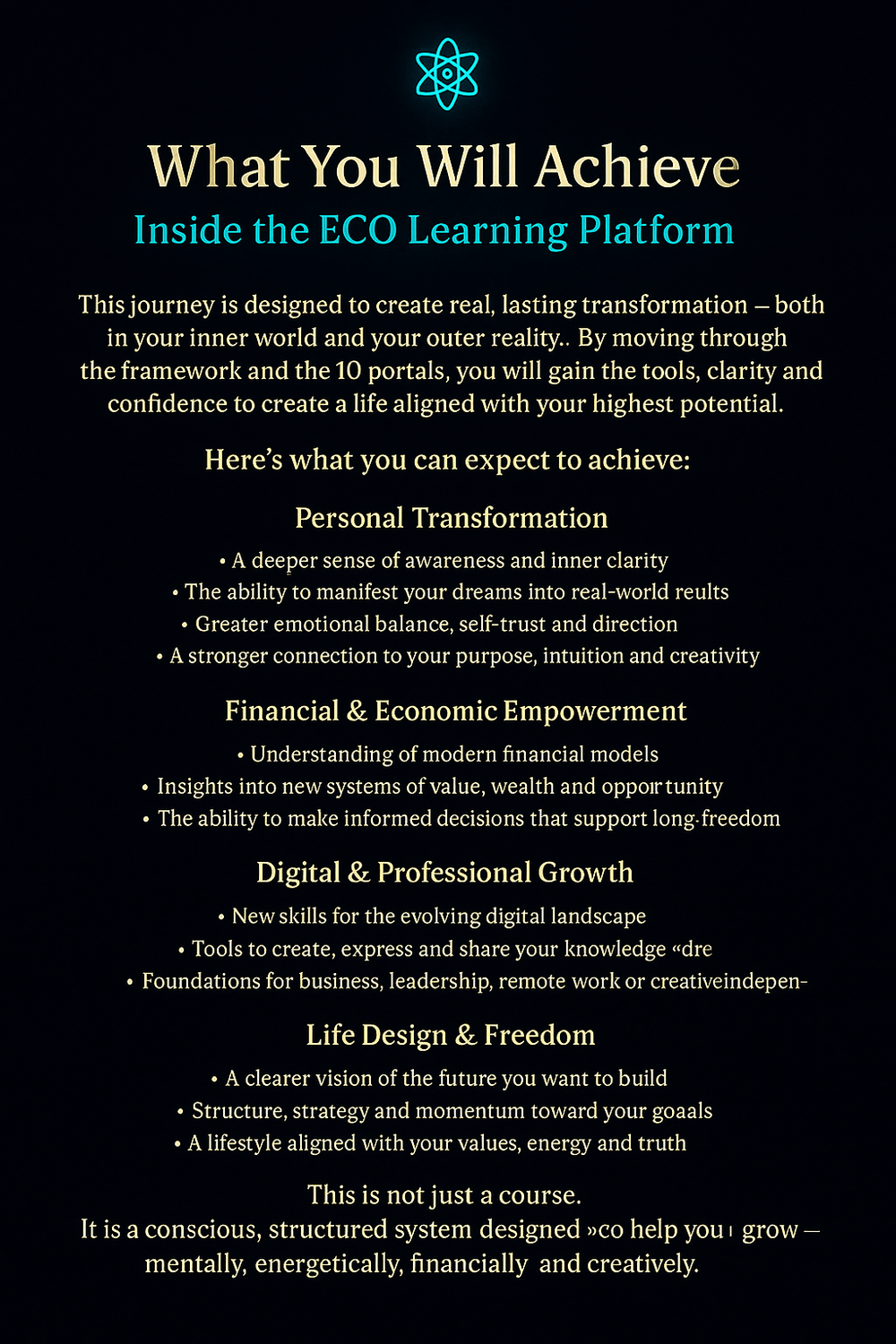 With this foundation in place, you are ready to explore the 10 portals of the ECO Learning Platform β a complete system designed to guide you through the future with knowledge, empowerment and direction.