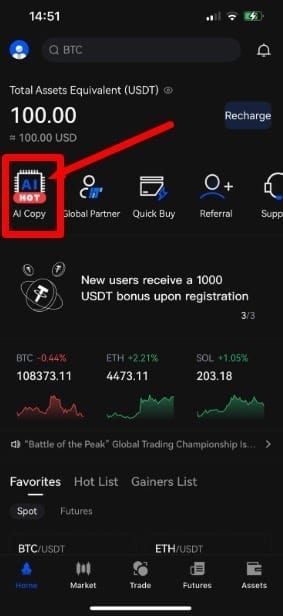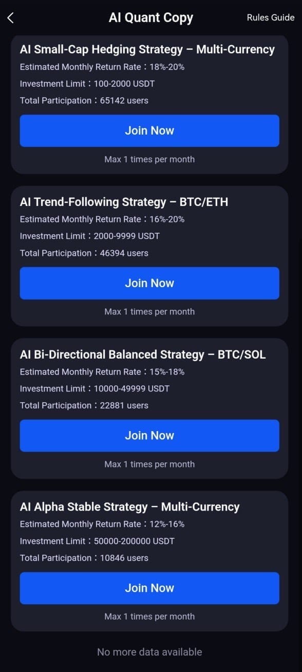 AI Copy is an investment tool provided by the Bitdu Exchange that follows contract trading strategies. Investors like you can invest funds and receive daily profit sharing. At the same time, AI Copy displays the daily trading strategies and execution details, making the investment process more transparent and convenient for you to review at any time