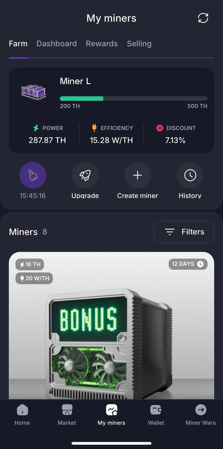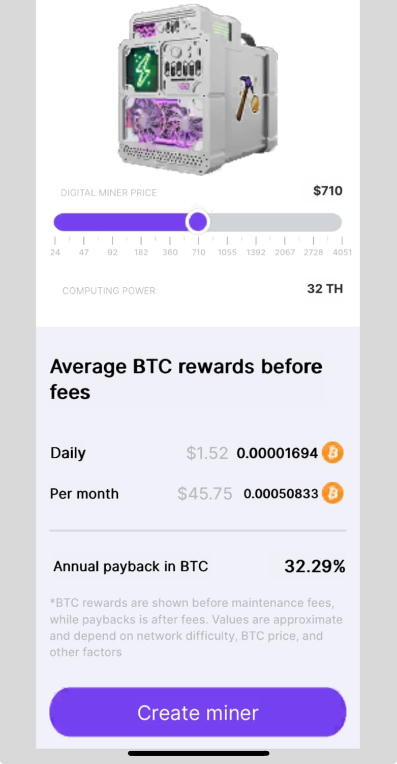 When you get a digital miner, you're not just receiving a virtual object — you're receiving a verified right to a share of physical Bitcoin mining equipment. This right is recorded on the blockchain as an NFT (non-fungible token).