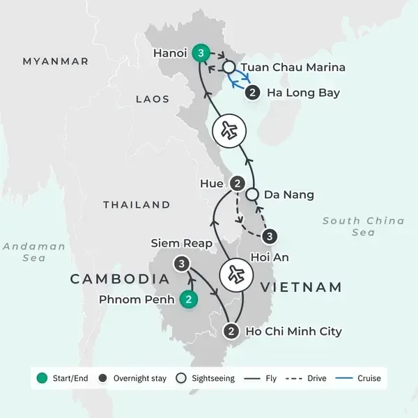 Discover the ancient stories, colorful flavors, and breathtaking landscapes of Vietnam and Cambodia on this unforgettable tour, complete with five-star accommodation throughout. Begin in Cambodia, where you’ll be captivated by the country’s storied past and compelling present in Phnom Penh, Siem Reap, and beyond.